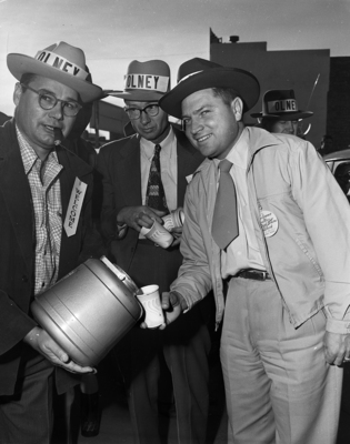 Sam Furr, left, Olney Chamber of Commerce director, pours coffee for Mike Simmons, right. J. C. Taylor of Olney holds more cups. Published in Fort Worth Star-Telegram morning edition January 24, 1952.