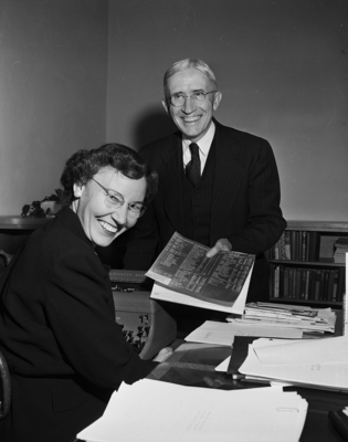 Dr. J. M. Price, director of the School of Religious Education, and Miss Gracie Knowlton, associate professor, confer on the course offered for church office secretaries at Southwestern Baptist Theological Seminary.