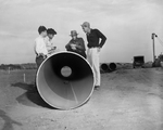 Looking through a section of the nation's largest crude line, constructed from West Texas to the Gulf Coast by West Texas Gulf Pipe Line Corporation. At the end of the pipe, left to right: Ralph Davis, B. H. Davis, Claude Anderson and G. C. Stevens.