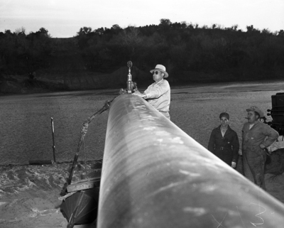 Roy Barker, inspector, checks the pressure gauge while the pipe was being tested for leaks. A lateral was laid off the line at Wortham to Longview, where it was tie into Mid-Valley Pipe Line Company system for movement of crude to Ohio.