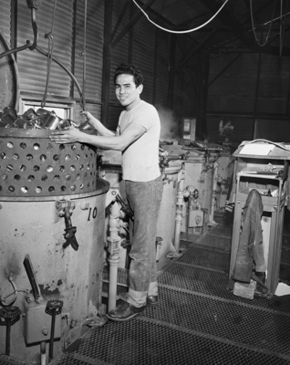 Shown is Raymond Riojas, featherweight champion at the Golden Gloves. He is show running a pressure cooker at work. Published in Fort Worth Star-Telegram evening edition January 25, 1952.