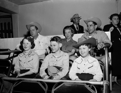 Among opening-night spectators at the 56th Southwestern Exposition and Fat Stock Show are, back, left to right, H. M. Pitner, Mrs. Pitner, Ufford Barnard, and, front, Patricia, left, and Linda, right, Pitner, and Don Paul Kluck, center, all of Denton, where Mr. Pitner owns a rodeo. Published in Fort Worth Star-Telegram evening edition January 28, 1952.