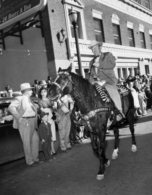 W. R. Watt, president manager of the snow, led the parade while riding his horse. Published in Fort Worth Star-Telegram morning edition January 26, 1952.