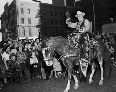 Leading the parade was Earnest Allen, parade marshal, who waved at crowds lining the streets. Published in Fort Worth Star-Telegram morning edition January 26, 1952.