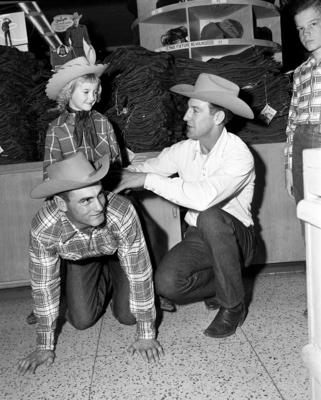 Patsy Finley, 7, is shown astraddle the back of Todd Whatley getting some pointers on horsemanship from Bill Linderman in Leonard's Department Store, where the two rodeo champions indorsed a line of Western clothing. Patsy is daughter of Mr. and Mrs. Wayne Finley of Floydada. Published in Fort Worth Star-Telegram morning edition January 27, 1952.