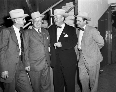 Meeting at the Southwestern Exposition and Fat Stock Show were, left to right, Roy Largent of Merkel, president of the American Hereford Association; Jess Andrew, president of the International Livestock Exposition at Chicago, and W. R. Watt, president-manager of the Fort Worth show. Published in Fort Worth Star-Telegram evening edition January 28, 1952.