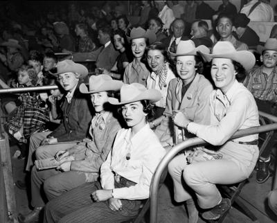 Watching a recent performance of the Southwestern Exposition and Fat Stock Show rodeo were front row, left to right, Misses Martha Pitcher of Tulsa, Judy Dustin of Bartlesville, Barbara Johnson of Bartlesville; back row, left to right, Mary Drummond of Hominy, Joyce Flinkkema of Tulsa, Jane Venita Saunders and Josie Schwartz. The girls, classmates at Oklahoma A&M, were the guests of Miss Saunders, daughter of Mr. and Mrs. T. B. Saunders. Published in Fort Worth Star-Telegram morning edition January 28, 1952.