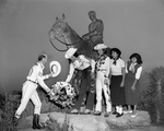 Hardy Murphy, left, chairman of Southern Oklahoma delegation, laid wreath at the base of the Will Rogers statue when a group of 400 Oklahoma residents came here for Admore and Southern Oklahoma Day at the Southeastern Exposition and Fat Stock Show. Sweethearts are, left to right, Miss Phyllis Priddy and Miss Shirley Cathey. Indian students are Miss Mildred Phillips, third from left, and Miss Josephine Carpitchie, right. Published in Fort Worth Star-Telegram morning edition January 28, 1952.
