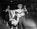 Joe Willis, 12-year-old Ector County 4-H Club member, stands with his 1,000-pound Hereford, Jerry, which was judged the grand champion of the boy's steer show at the Southwestern Exposition and Fat Stock Show. Don Good, Kansas State College, Manhattan, the judge, is at the rear. Published in Fort Worth Star-Telegram morning edition January 27, 1952.