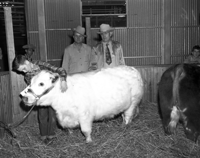 Three generations of Shorthorn showmen are shown at the Southwestern Exposition and Fat Stock Show. Pictured, left to right, C. M. Caraway III, C. M. Caraway Jr. and C. M. Caraway Sr., Comanche County Shorthorn breeders. The steer was reserve Shorthorn in the boys' steer show. Published in Fort Worth Star-Telegram evening edition January 28, 1952.