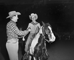 Twelve-year-old Jimmy Thompson of Gladewater took first place at the afternoon horse show of the Southwestern Exposition and Fat Stock Show in the children's Saddle Pony Class, riding Little Pony. Jimmy gets his ribbon from Cowboy movie Actor Wild Bill Elliott. Published in Fort Worth Star-Telegram morning edition January 27, 1952.