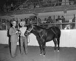 Cuban Brown, owned by Summer Pingree & Son of Havana, won the grand champion Quarter horse stallion award in the halter class at the Southwestern Exposition and Fat Stock Show. Raymond Hollingsworth, at left, secretary of the American Quarter Horse Association, is presenting award to T. C. Jinkens, Lake Worth, handler for the Cuban interests. Published in Fort Worth Star-Telegram morning edition January 27, 1952.
