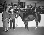Dee Gee, 6-year-old maiden mare won the grand championship award in the Quarter horse halter class for mares at the Southwestern Exposition and Fat Stock Show. She is owned by Miss Wanda Harper, 20, right, of Mason. Presenting the award are Raymond Hollingsworth of Amarillo, secretary of the American Quarter Horse Association, and Martha Parks, 5, daughter of Mrs. Roy Parks Jr. of Midland. Published in Fort Worth Star-Telegram morning edition January 28, 1952.