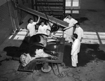 The new hospital's staff is especially proud of their radiological equipment which can be used for both treatment and examination. Here a Hereford bull is placed on a hydraulically operated table for X-ray treatment of an injured hoof.