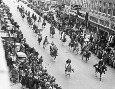 Part of the riders in the parade heralding the opening of the Southwestern Exposition and Fat Stock move north on Main Street. Men on horses in the streets and a crowd of people on the side.