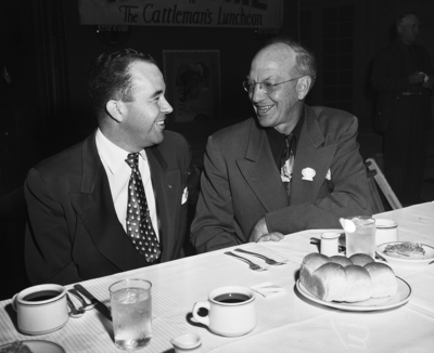 W. Beverly Howell, left, President of the Dallas Agricultural Club, converses with W. L. Pier, president of the Fort Worth Farm and Ranch Club, at the luncheon of the Cattleman magazine at Pioneer Palace.