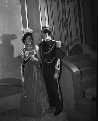 Series on dress rehearsal for "The Merry Widow". Kitty Mattern, Viennese beauty in real life, is Olga, an adornment of the Marsovian embassy in the operetta. The general, ready to melt under Kitty's glance, is Arthur Faguy-Cote.