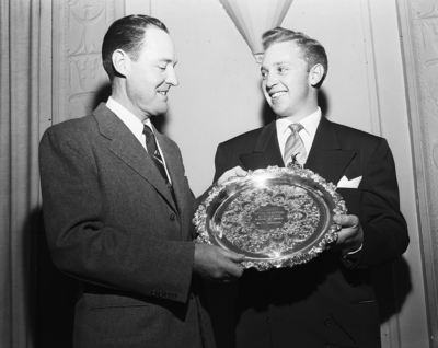 William S. Dameron Junior of Hereford, right, is shown receiving a silver tray from Ted Alexander of Canadian, vice president of the Texas Hereford Association, for obtaining the most new members for the association last year.