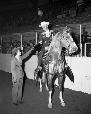 Sky Rocket, owned and ridden by Clyde Carter of Fort Worth, won the Palomino silver mounted championship in finals at the Southwestern Exposition and Fat Stock Show. Presenting award is Mrs. Bob Lucas of Fort Worth. Published in Fort Worth Star-Telegram evening edition January 29, 1952.