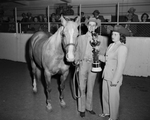 Kenneth Casey, son of Glen L. Casey of Amarillo, holds the trophy won by Wilson's Lady, owned by his father, when she was judged grand champion Palomino stock horse mare. Presenting the trophy is Mrs. Jo Ann Kraetzmeir of Vanderpool. Published in Fort Worth Star-Telegram morning edition January 29, 1952.