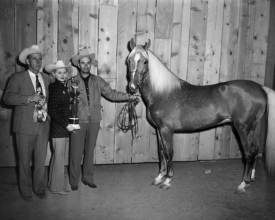 Society Man, a 2-year-old, won the grand championship for pleasure type Palomino stallions in the halter class at the Southwestern Exposition and Fat Stock Show. He is owned by Raymond McGowan, left, Polly McGowan, center, and Jack Spillman, right, all of Dallas. Published in Fort Worth Star-Telegram morning edition January 29, 1952.