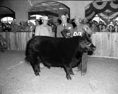 Stock Show. W. R. Watt, left, Amon Carter, center and W. C. Anderson Jr. with "Gold Strike", Aberdeen-Angus named grand champion steer of the Stock Show.
