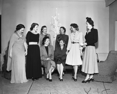 The ups and downs of hemlines were reflected by the past presidents of the Fort Worth Junior League, dressed as they were at the time they were presidents. Shown, left to right, seated are Mmes. J. W. Shugart Junior and J. A. Gooch, and standing, Mmes. J. B. Hamilton, Harry Logan Junior, George M. Merrill, Weir Phillips, O. K. Shannon Junior, and Bert K. Smith Junior.
