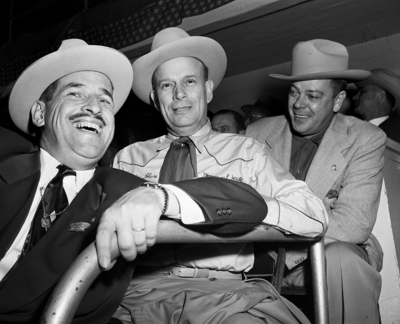 Part of a group of district governors of Lions International and their wives who filled a box at the Southwestern Exposition and Fat Stock Show rodeo performance, Lions Day, were, left to right, District Governors Fred O. Mills of Anahuac and Orval Shore of Mineral Wells, and State Secretary of Lions Marlowe Fisher of Austin. Other governors with the group were Dr. Lewis Kline of Del Rio, Gordon A. Dotson of Houston and F. L. Cochran of Odessa. Published in Fort Worth Star-Telegram evening edition January 30, 1952.