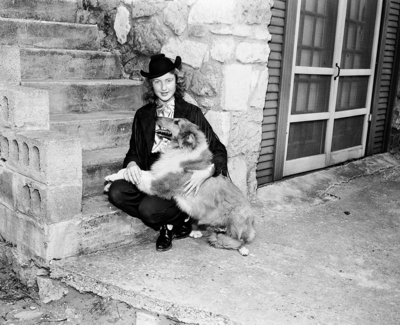 Thirteen-year-old dog breeder, Patsy Ann Carleton holds Priscilla, her pet collie she is selling to a client in Guatemala. She was the daughter of Second Lieutenant Thomas Lee "T. L." Carleton, and Mary Myrtle Carleton. Published in the morning edition, March 13, 1950.