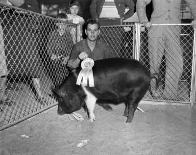 Johnny Younts, 17, of the Waco State Home adds another rosette and ribbon to his collection as his Hampshire barrow is named reserve grand champion. Published in Fort Worth Star-Telegram morning edition January 30, 1952.