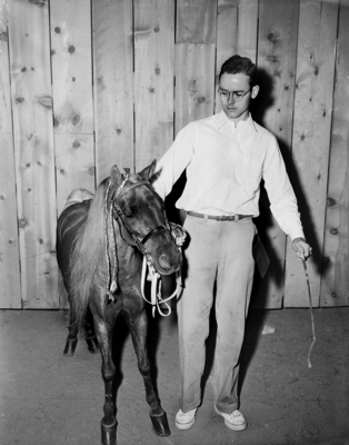 Reaping Gold C, 8-year-old Shetland stallion owned by C. L. Carlock of Oklahoma City and shown by Dick Hadley, holding the animal, won the grand championship award for Shetland stallions in the halter class at the Southwestern Exposition and Fat Stock Show. Published in Fort Worth Star-Telegram morning edition January 30, 1952.