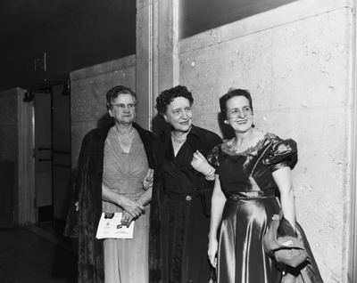 "The Merry Widow" audience. At the first presentation of a Civic Opera Association performance at the Southwestern Exposition and Fat Stock Show brought out formal attire and western togs. Happy over the first night turnout was Mrs. O. R. Grogan, left, Opera Guild president; Miss Margaret Sammer, center, and Mrs. Grace Ward Lankford, president of the Fort Worth Piano Teachers' Forum.