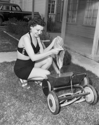 Cynthia Ann Rainbolt, 22-year-old clerk at Container Corporation here, shown filling the hopper of a lawnmower-fertilizer spreader invented by a co-worker, C. R. Kientz. She is daughter of Mrs. O'Zellma Rainbolt of 111 East Sixth, designer who incidentally, created the shorts-halter attire seen here. Published in Fort Worth Star-Telegram morning edition, March 16, 1950.