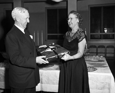 Mrs. W. G. Norman hands Reverend L. D. Anderson a gift from church members at a reception celebrating his 38th anniversary as pastor of the First Christian Church.