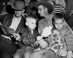 Getting prepared for the start of the Southwestern Exposition and Fat Stock Show's rodeo are these members of the Stamford Day delegation, left to right, Mack Doty and his son, Jerry Doty, and C. L. Ford and his boy, Bruce Terry Ford. Published in Fort Worth Star-Telegram evening edition January 31, 1952.