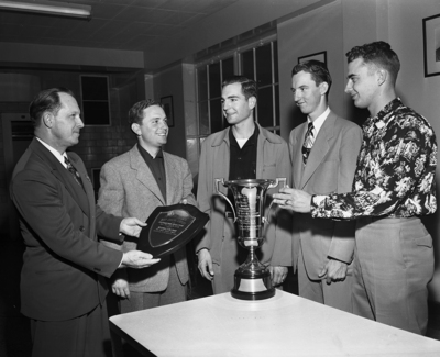 G. A. McDonald, Chicago, with the National Livestock and Meat Board, presents a plaque and cup to the winning team at the Intercollegiate Meat Judging Contest. Left to right, J. L. Younger, Lyle Neagle, Willis Nichelson and Wayne Krehbiel. Younger also was high-point man for the annual meet open to agricultural colleges. Published in Fort Worth Star-Telegram morning edition January 31, 1952.