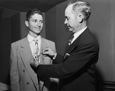 Rufus Peeples, right, of Tehuacana, superintendent of the Southwestern Exposition and Fat Stock Show collegiate livestock judging contest, pins on the spur tie clip won by William M. Thomas of Texas A&M College, high individual scorer. Published in Fort Worth Star-Telegram morning edition January 31, 1952.