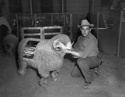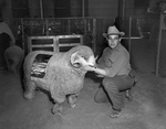 Miles Pierce, Alpine Rambouillet breeder, holds his champion ram after winning top honors in the fine wool sheep judging at the Southwestern Exposition and Fat Stock Show. The 220-pound ram was selected over a field of top competition. Published in Fort Worth Star-Telegram morning edition January 31, 1952.