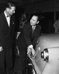 D. R. Crandall Junior, right, district sales manager for the Ford Motor Company at Dallas, points to the location of the gas filler pipe in the 1952 Ford to A. H. Lightfoot, president of Texas Motors.