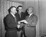 Frank Richards, secretary of the Aberdeen-Angus Association, Chicago, at the right, is presenting W. N. Anderson of West Liberty, Iowa, with a $1,000 check for showing the grand champion steer at the Fort Worth Show. It was an Angus. In the center is Paul Hinck who feeds for Anderson.