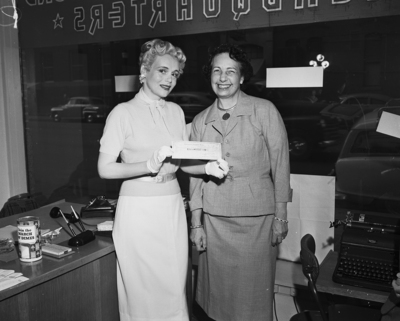 Marie Wilson, left, is shown here as she was paid $5,000 for a day's work as secretary for Coca-Cola Bottling Company. Mrs. C. A. Lupton, right, presented the check, which Miss Wilson turned over to the March of Dimes.