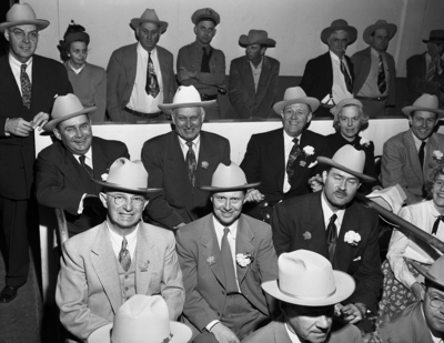 At the show-Other rodeo fans, special guests of Amon Carter, included left to right, Dallas County Judge Lew Sterrett, Dallas Mayor J. B. Adoue Jr., P. B. Garrett, president of the Texas Bank & Trust Company of Dallas; bottom row, left to right, Fort Worth Mayor Edwards Barney Hemphill and Zeke French. Published in Fort Worth Star-Telegram evening edition February 1, 1952.