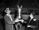 Adelle's Blue Bell, shown, owned by E. L. Burgess of Sherrill, was named champion 2-year-old walking horse both sexes at the Southwestern Exposition and Fat Stock Show. Mrs. H. H. Wilkinson of Highland Farms, Fort Worth, presents the award to E. L. O'Callaghan, handler. Published in Fort Worth Star-Telegram morning edition February 1, 1952.