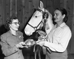 Mrs. Pauline Utz of Sulphur Springs, right, receives award from Miss Elna Wilkinson of Fort Worth for White Man, champion yearling walking horse. Published in Fort Worth Star-Telegram morning edition February 1, 1952.
