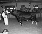 This 2,825-pound Holstein bull, shown by Donaho's Holstein Farm Floresville, was selected grand champion at the Southwestern Exposition and Fat Stock Show. Howard Rash, Donaho herdsman, poses the 5-year-old. Published in Fort Worth Star-Telegram morning edition February 1, 1952.