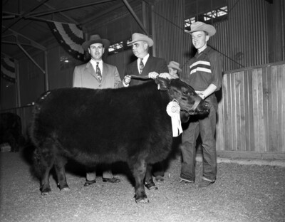 1952 Stock Show. reserve champion steer of the show. Left to right, Joe Willis of Odessa, W. R. Watt, Amon Carter Jr., Jess Andrew and Amon Carter, shown with 1,000-pound Hereford, judged reserve champion steer of the stock show.