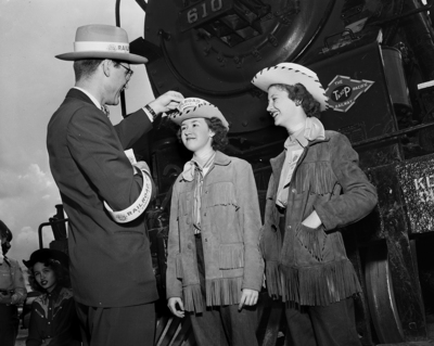 Lee Clark, left, Missouri Pacific Line representative, pins hatbands on Barbara Harris and Joyce Sellers. There is a train behind in the background. Published in Fort Worth Star-Telegram morning edition February 2, 1952.