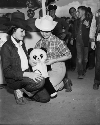 Elizabeth Rice and Linda Smith, admire a toy panda. Both are students at William James Junior High School. Published in Fort Worth Star-Telegram morning edition February 2, 1952.