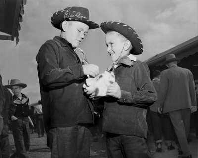 David Price, 12, and Pat Price, 9, students at Carroll Peak Elementary School, drop change in a piggy bank won on the midway. Published in Fort Worth Star-Telegram morning edition February 2, 1952.