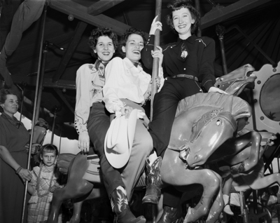 Barbara Meek, Clarice Hunter, and Shirley McCann, enjoy a merry-go-around ride. Published in Fort Worth Star-Telegram morning edition February 2, 1952.